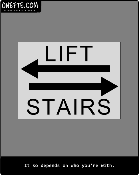 On-screen sign: LIFT / STAIRS