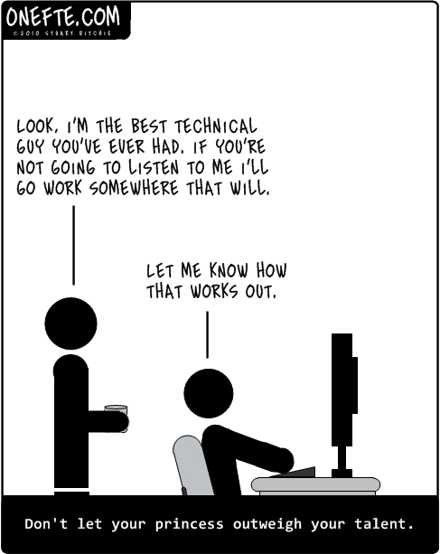 FTE #1: Look, I’m the best technical guy you’ve ever had. If you’re not going to listen to me, I’ll go work somewhere that will.