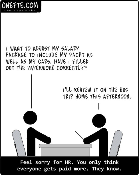 Caption: Feel sorry for HR. You only think everyone gets paid more. They know.