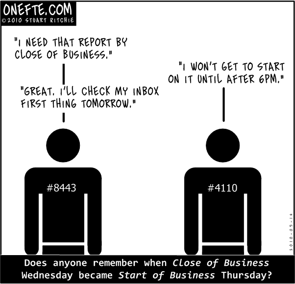 Caption: Does anyone remember when Close of Business Wednesday became Start of Business Thursday?