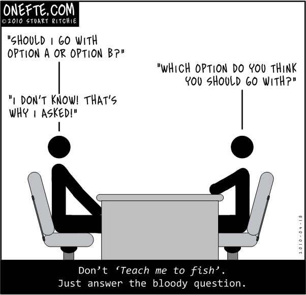 Caption: Don’t “Teach me to fish”. Just answer the bloody question.